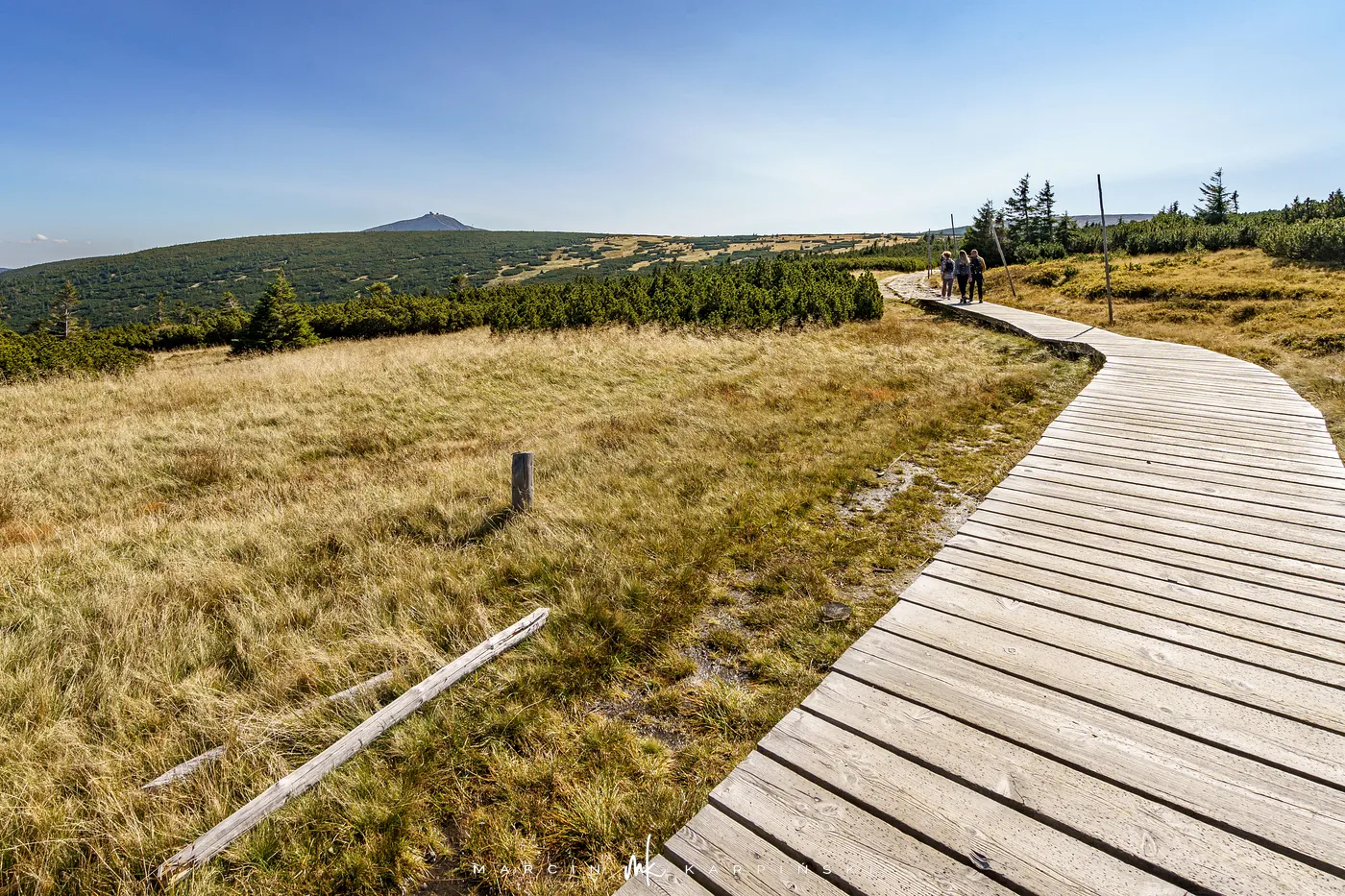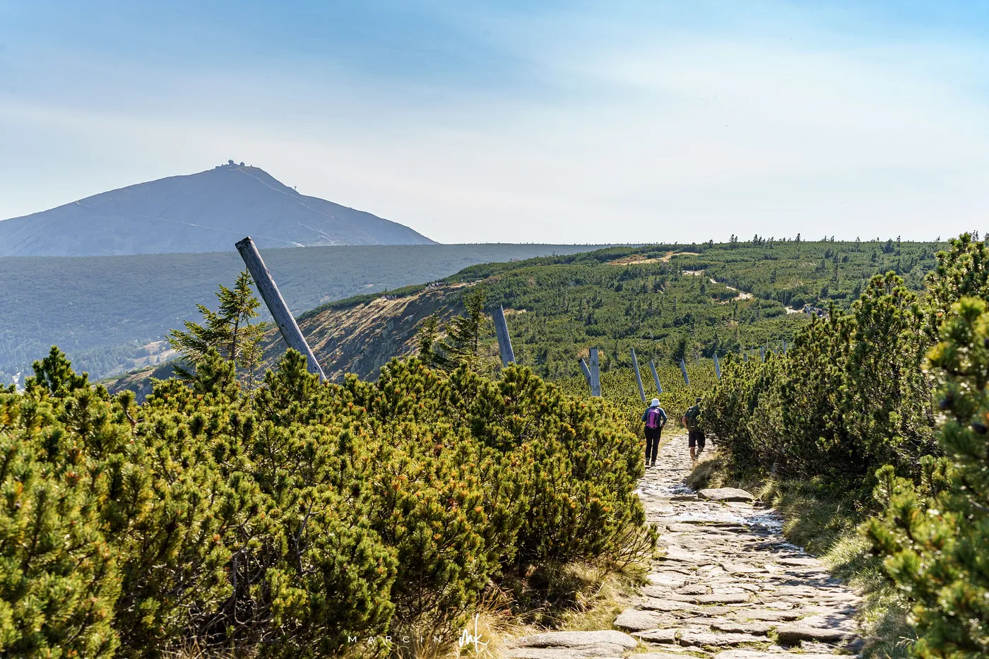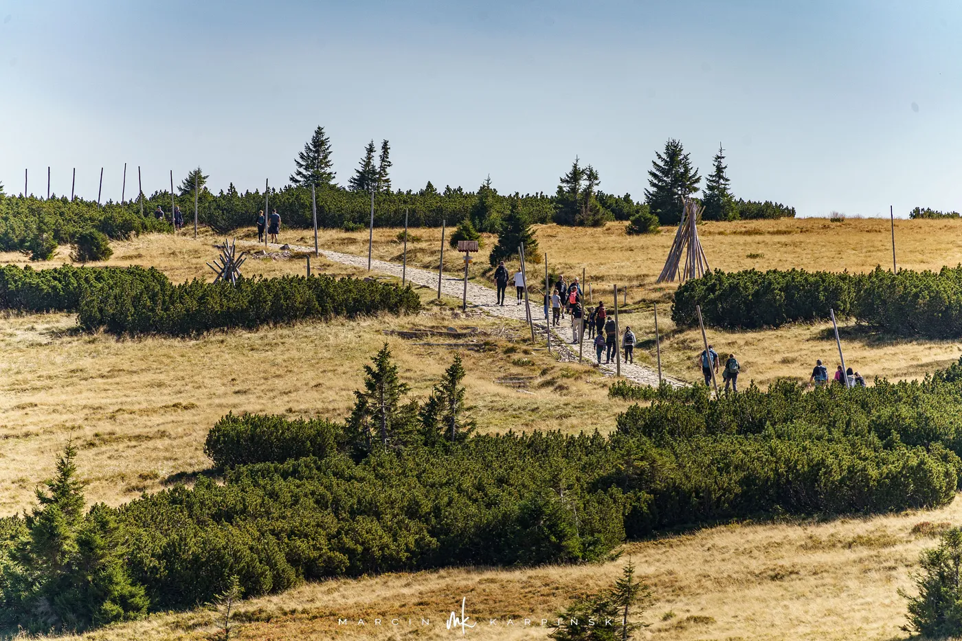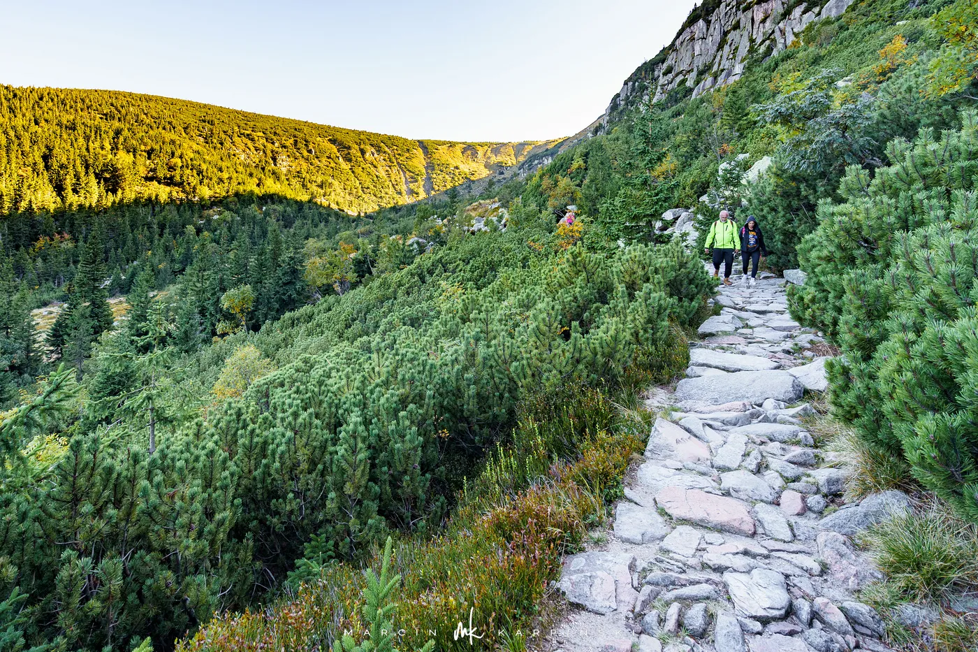 Początkowo idziemy drewnianą kładką przez łąki. Po chwili ścieżka znów zagłębia się w las i zaczyna piąć się ku górze. Po krótkim podejściu docieramy do Pielgrzymów - trzech monumentalnych skalnych baszt, których kształty powstały wskutek długotrwałego działania wiatru, mrozu i deszczu. Idąc dalej, szlak wynurza się z lasu, a droga prowadzi wśród kosodrzewiny. Po około 1 godzinie i 50 minutach docieramy do Słonecznika. To charakterystyczna, 12-metrowa formacja skalna, która przez wieki służyła mieszkańcom Kotliny Jeleniogórskiej jako naturalny zegar słoneczny. W tym miejscu otwierają się już szerokie panoramy: na zachód ku Górom Izerskim, na północ ku Kotlinie Jeleniogórskiej i Górom Kaczawskim, a na wschód ku Rudawom Janowickim i widocznej już z tego miejsca Śnieżce.