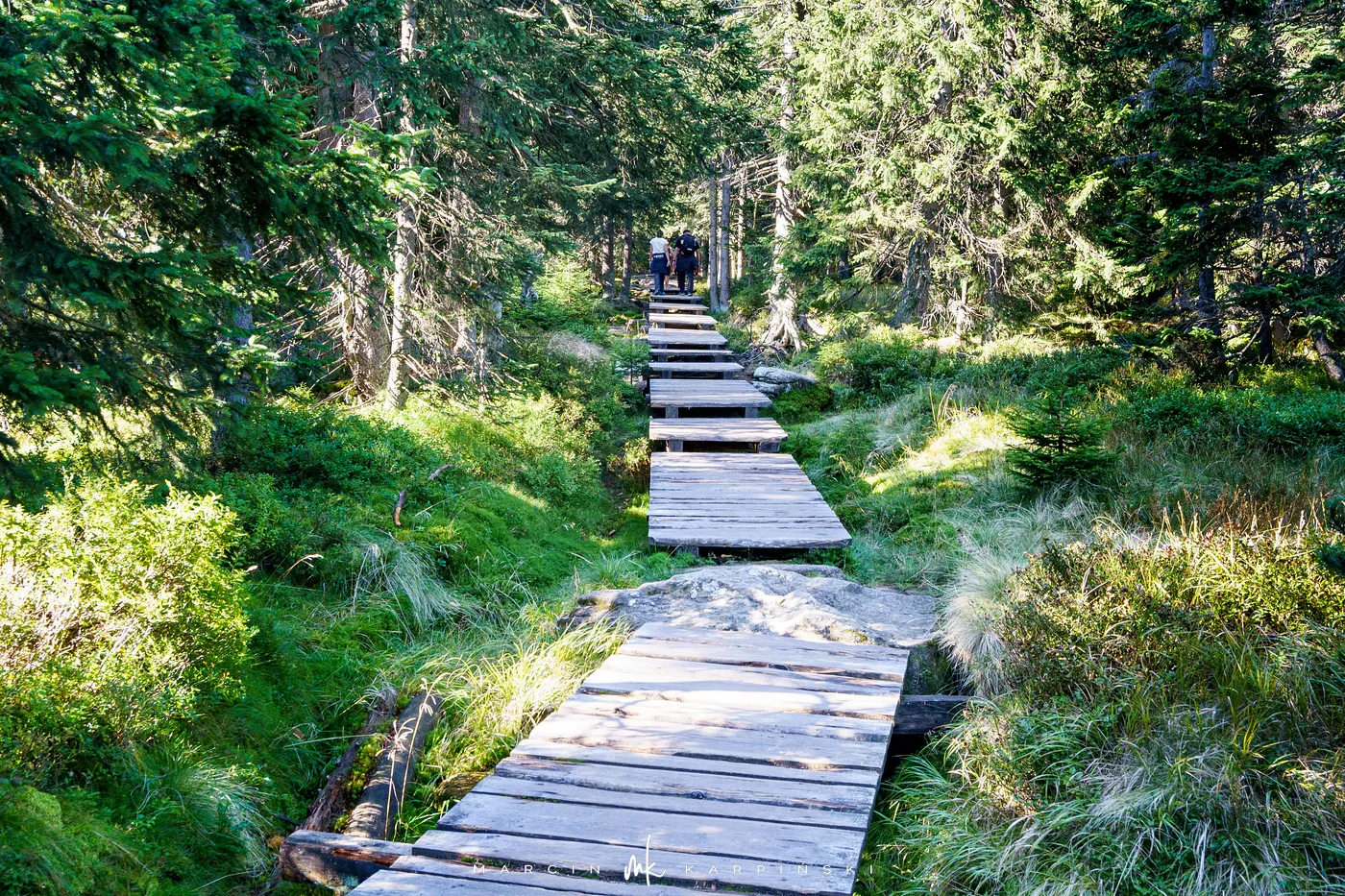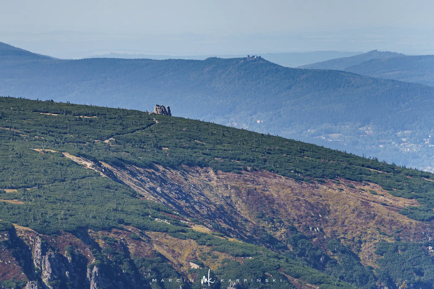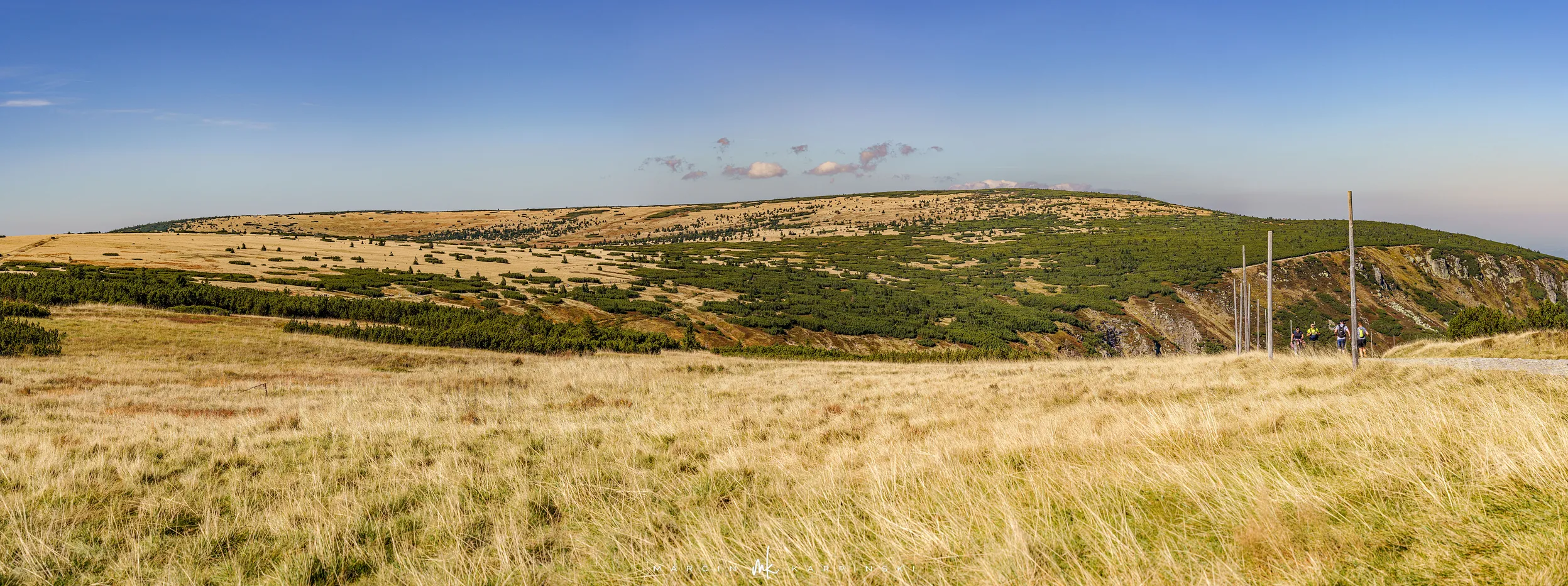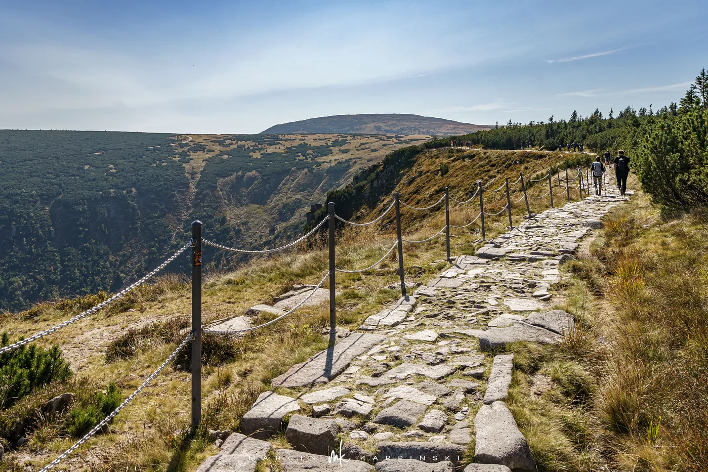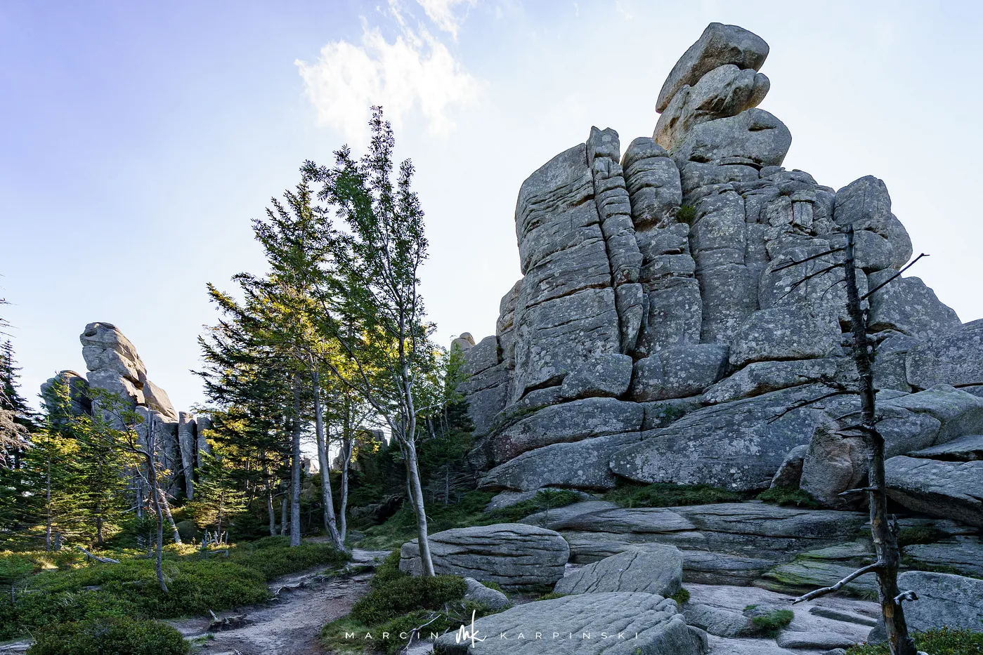 Początkowo idziemy drewnianą kładką przez łąki. Po chwili ścieżka znów zagłębia się w las i zaczyna piąć się ku górze. Po krótkim podejściu docieramy do Pielgrzymów - trzech monumentalnych skalnych baszt, których kształty powstały wskutek długotrwałego działania wiatru, mrozu i deszczu. Idąc dalej, szlak wynurza się z lasu, a droga prowadzi wśród kosodrzewiny. Po około 1 godzinie i 50 minutach docieramy do Słonecznika. To charakterystyczna, 12-metrowa formacja skalna, która przez wieki służyła mieszkańcom Kotliny Jeleniogórskiej jako naturalny zegar słoneczny. W tym miejscu otwierają się już szerokie panoramy: na zachód ku Górom Izerskim, na północ ku Kotlinie Jeleniogórskiej i Górom Kaczawskim, a na wschód ku Rudawom Janowickim i widocznej już z tego miejsca Śnieżce.