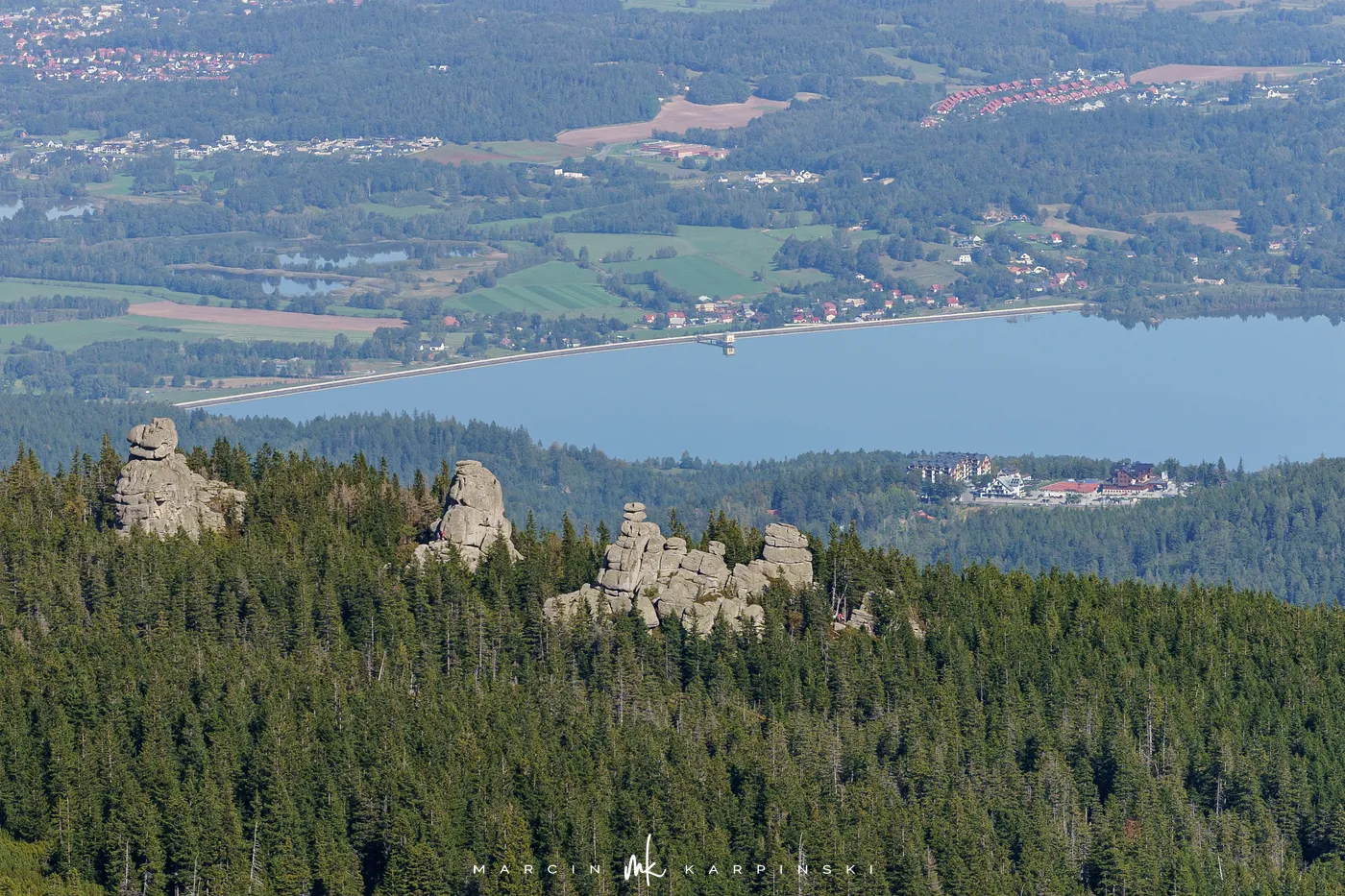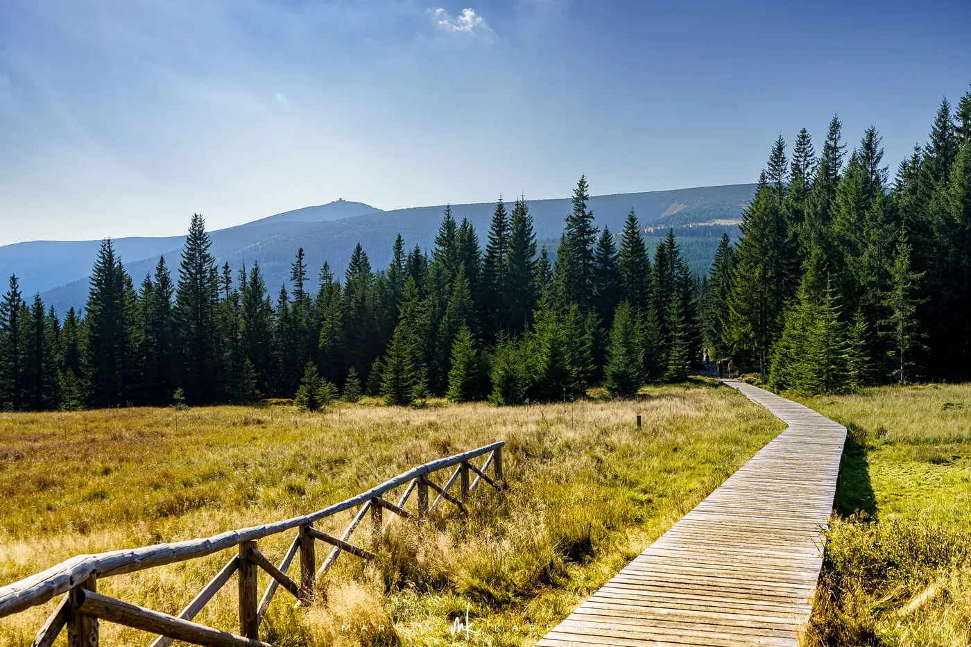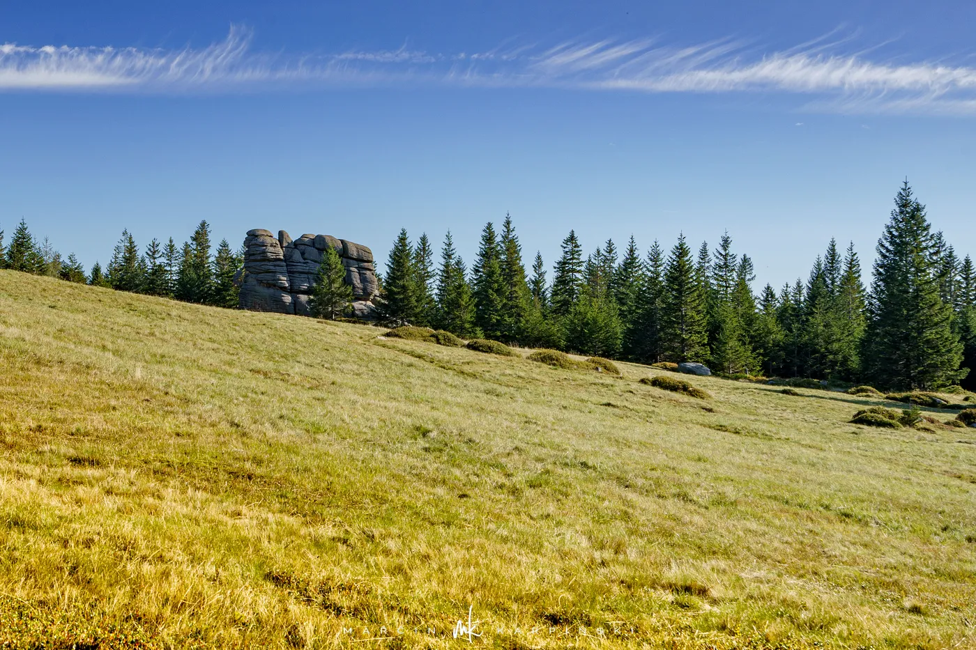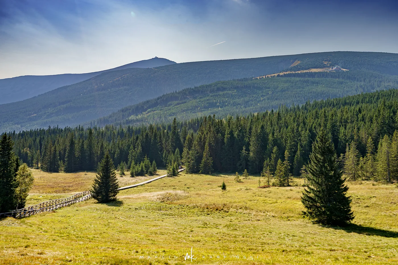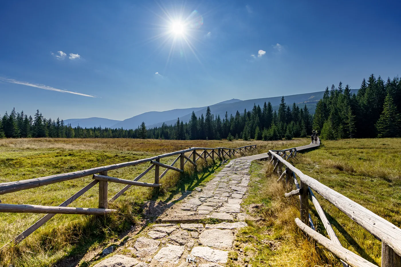 Początkowo idziemy drewnianą kładką przez łąki. Po chwili ścieżka znów zagłębia się w las i zaczyna piąć się ku górze. Po krótkim podejściu docieramy do Pielgrzymów - trzech monumentalnych skalnych baszt, których kształty powstały wskutek długotrwałego działania wiatru, mrozu i deszczu. Idąc dalej, szlak wynurza się z lasu, a droga prowadzi wśród kosodrzewiny. Po około 1 godzinie i 50 minutach docieramy do Słonecznika. To charakterystyczna, 12-metrowa formacja skalna, która przez wieki służyła mieszkańcom Kotliny Jeleniogórskiej jako naturalny zegar słoneczny. W tym miejscu otwierają się już szerokie panoramy: na zachód ku Górom Izerskim, na północ ku Kotlinie Jeleniogórskiej i Górom Kaczawskim, a na wschód ku Rudawom Janowickim i widocznej już z tego miejsca Śnieżce.