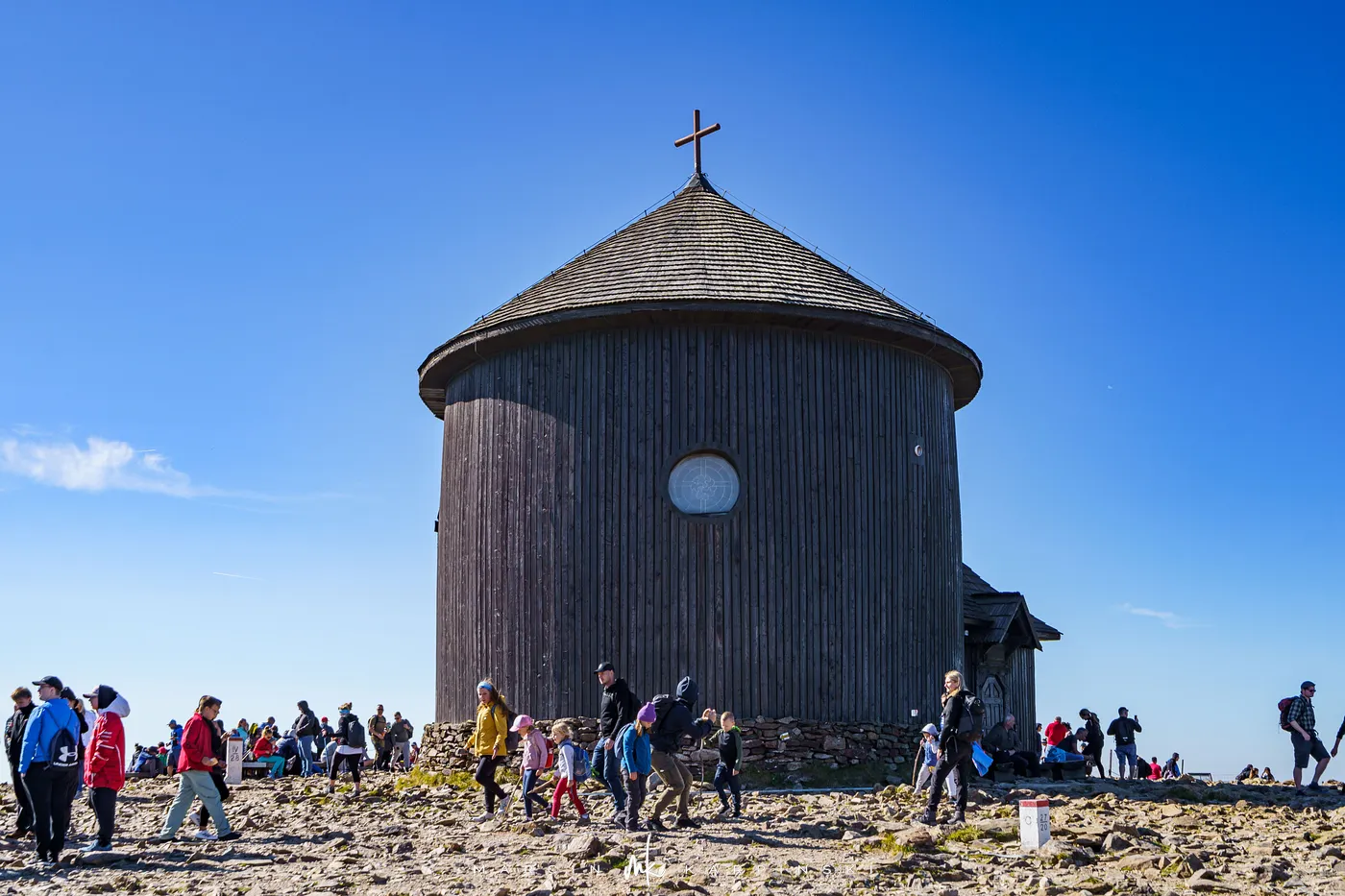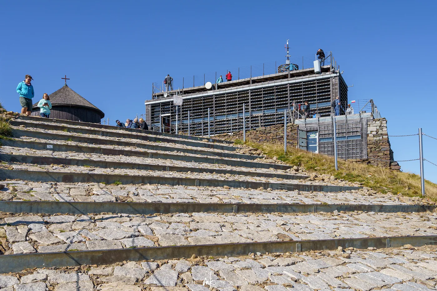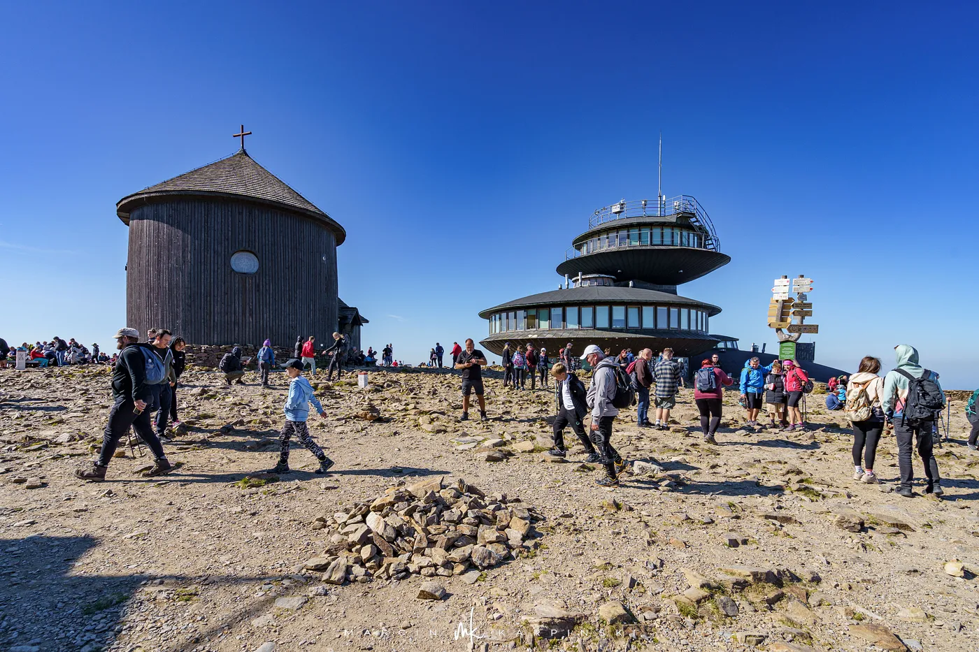 Po 25 minutach od wyjścia spod schroniska stajemy na szczycie Śnieżki. Na wierzchołku wita nas charakterystyczny kompleks budynków w kształcie spodków Wysokogórskiego Obserwatorium Meteorologicznego. Tuż obok znajduje się Kaplica św. Wawrzyńca z XVII wieku. To najstarszy budynek na szczycie, w którym co roku w sierpniu odbywa się msza odpustowa. Z wierzchołka roztacza się niezwykły widok - na południe ku Czechom i dolinie Łaby, na północ ku rozległej Kotlinie Jeleniogórskiej. W pogodne dni można dostrzec nawet Wrocław, Ślężę czy też Beskidy.