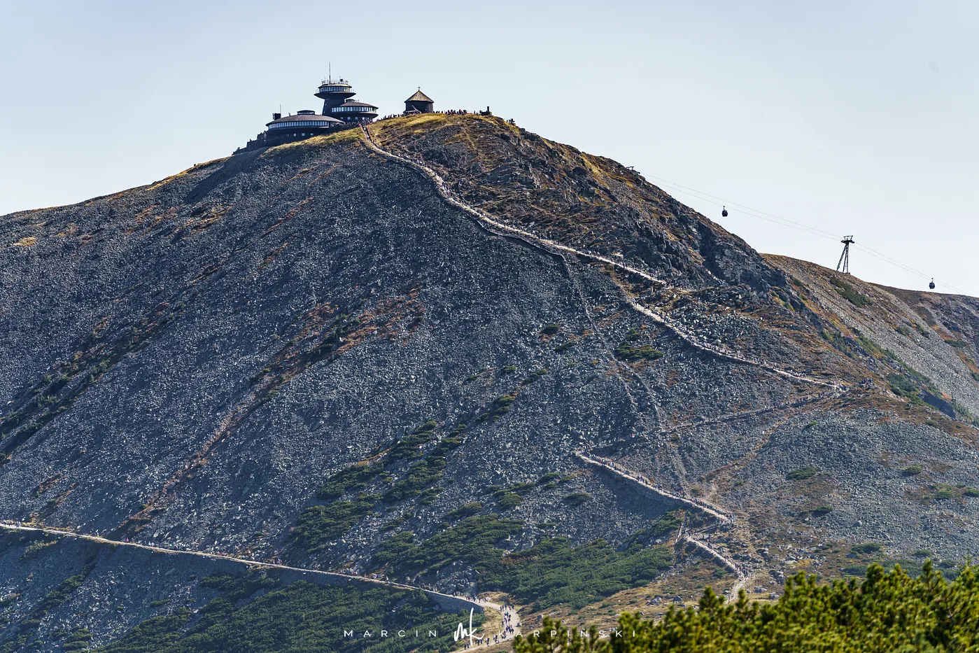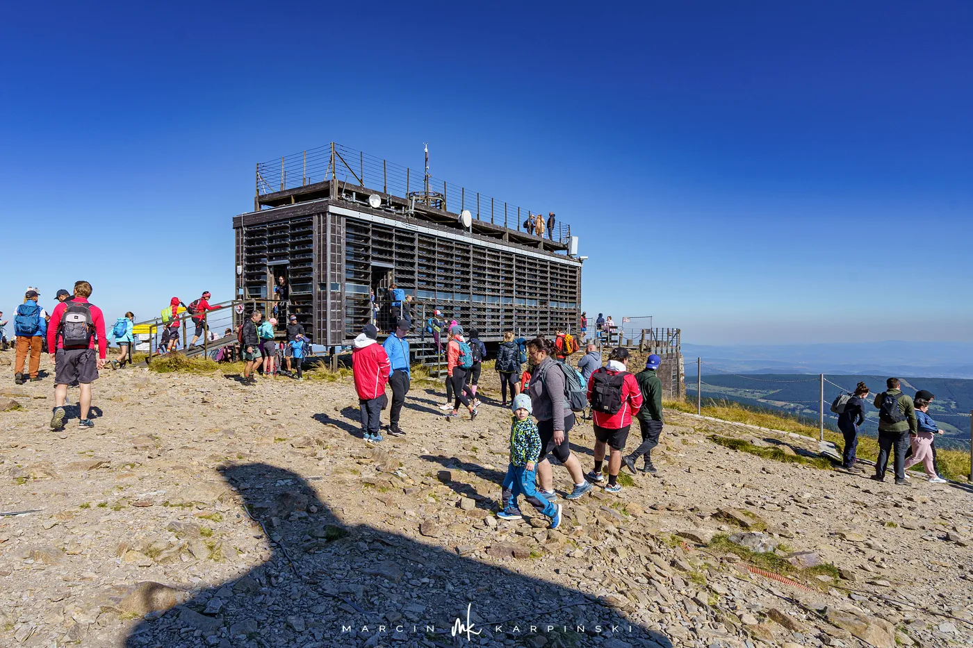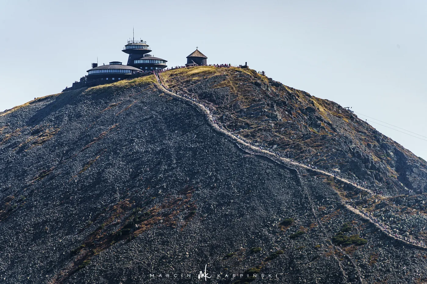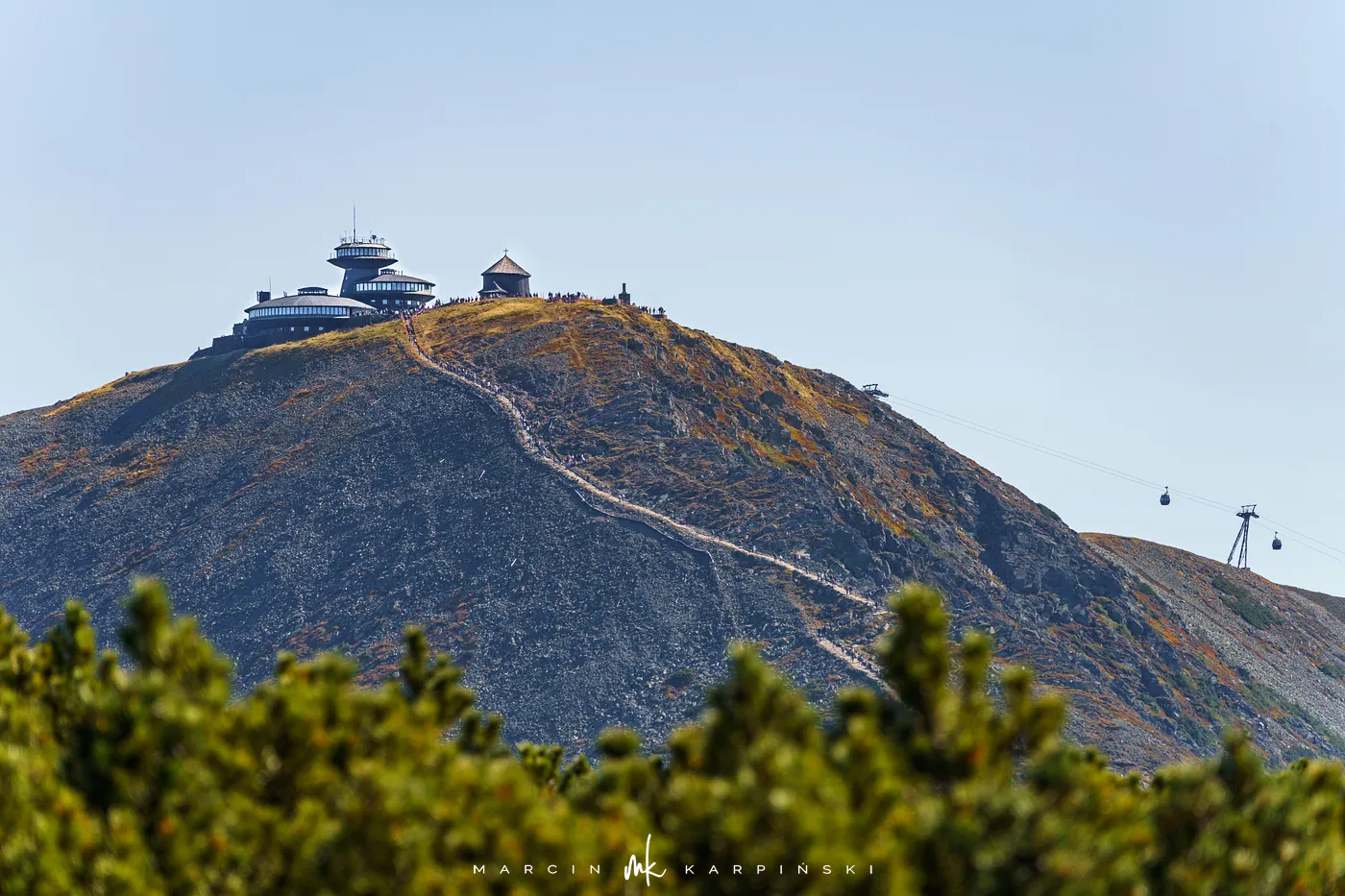 Po 25 minutach od wyjścia spod schroniska stajemy na szczycie Śnieżki. Na wierzchołku wita nas charakterystyczny kompleks budynków w kształcie spodków Wysokogórskiego Obserwatorium Meteorologicznego. Tuż obok znajduje się Kaplica św. Wawrzyńca z XVII wieku. To najstarszy budynek na szczycie, w którym co roku w sierpniu odbywa się msza odpustowa. Z wierzchołka roztacza się niezwykły widok - na południe ku Czechom i dolinie Łaby, na północ ku rozległej Kotlinie Jeleniogórskiej. W pogodne dni można dostrzec nawet Wrocław, Ślężę czy też Beskidy.