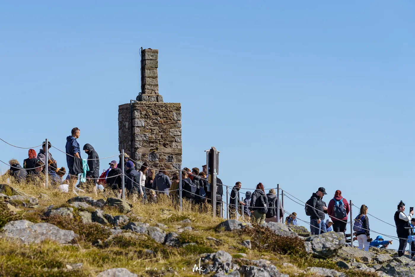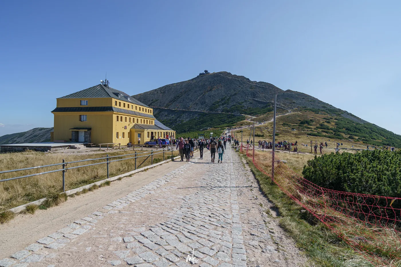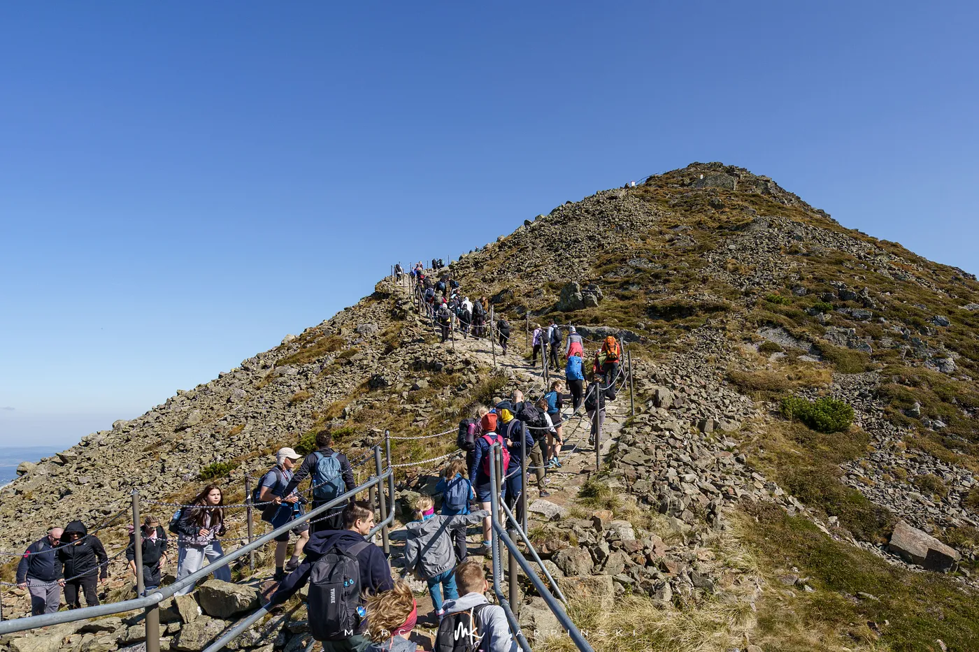 Przy Słoneczniku skręcamy w lewo na czerwony szlak, który prowadzi niemal płasko aż do Domu Śląskiego pod Śnieżką. Po drodze mijamy w dole dwa karkonoskie stawy polodowcowe: najpierw rozległy Wielki Staw, a następnie mniejszy, ale równie urokliwy Mały Staw. Po około godzinie marszu docieramy do schroniska. Stąd czeka nas ostatnie podejście, czyli 200 metrów przewyższenia na szczyt. Czerwony szlak w tym miejscu jest jednokierunkowy i prowadzi wąską, skalną ścieżką ubezpieczoną poręczami z łańcuchów.