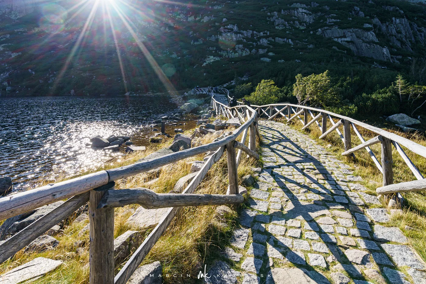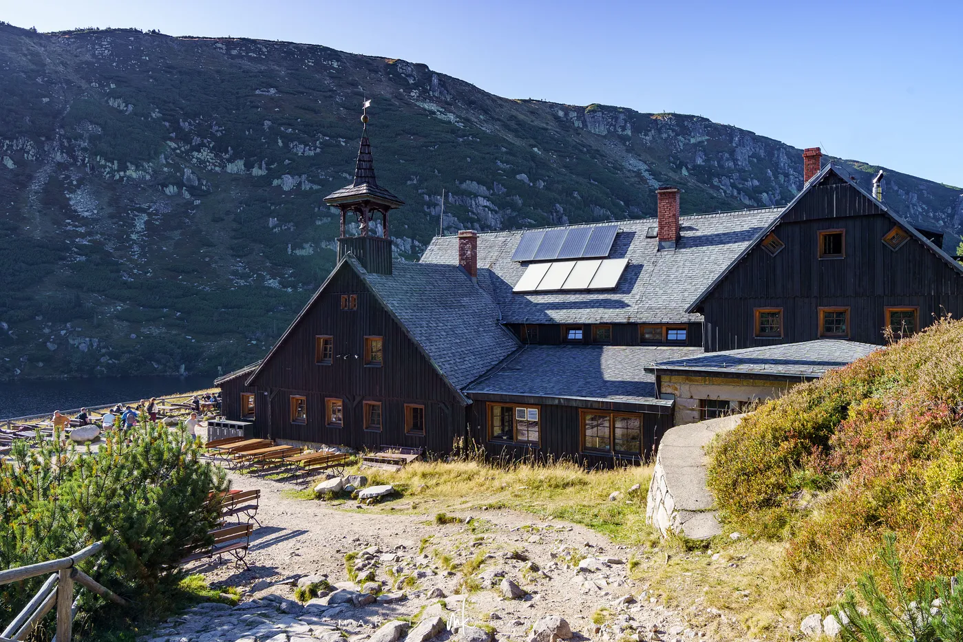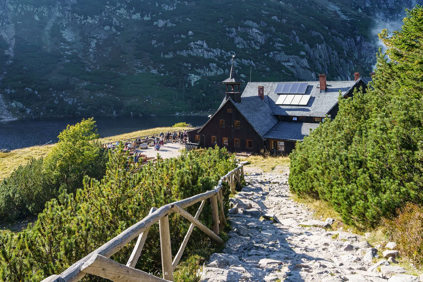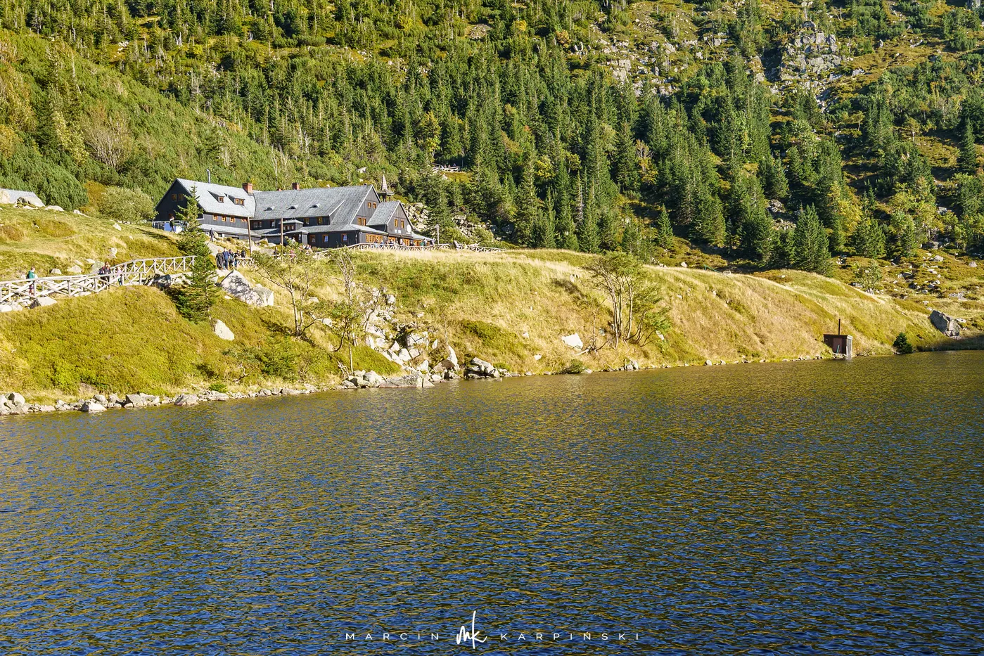 Po krótkim odpoczynku rozpoczynamy zejście Drogą Jubileuszową - szeroką i łagodną trasą, którą wytyczono na początku XX wieku. Schodzimy czerwonym, a następnie niebieskim szlakiem, i po około 20 minutach ponownie stajemy pod Domem Śląskim. Stąd kontynuujemy wędrówkę w stronę Karpacza. Ścieżka prowadzi obok miejsca dawnej strażnicy granicznej. Następnie mijamy Strzechę Akademicką, jedno z najstarszych i największych schronisk w Karkonoszach. Po kilkunastu minutach docieramy do malowniczego schroniska Samotnia, położonego tuż nad brzegiem Małego Stawu. To jedno z najbardziej urokliwych miejsc w całych Sudetach.