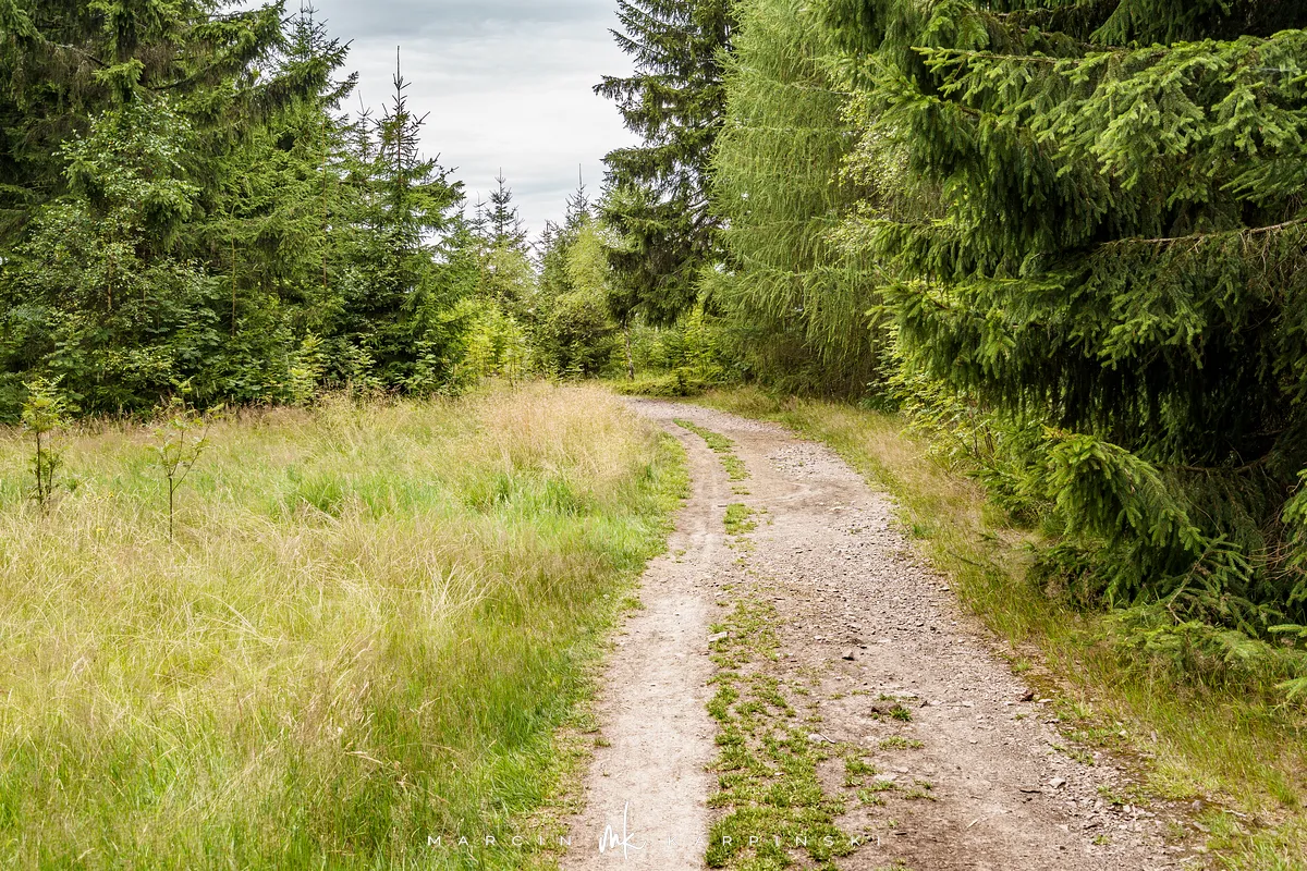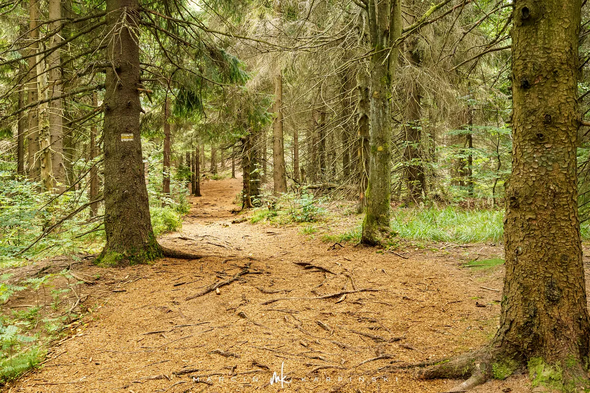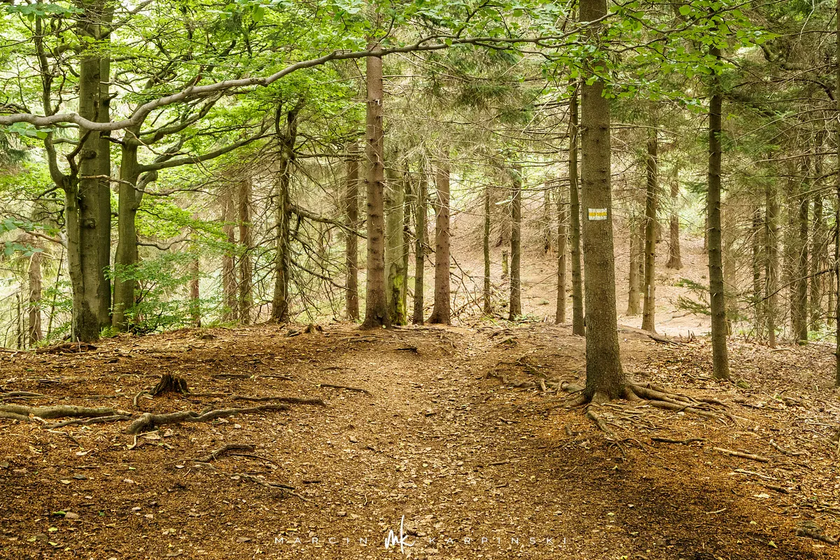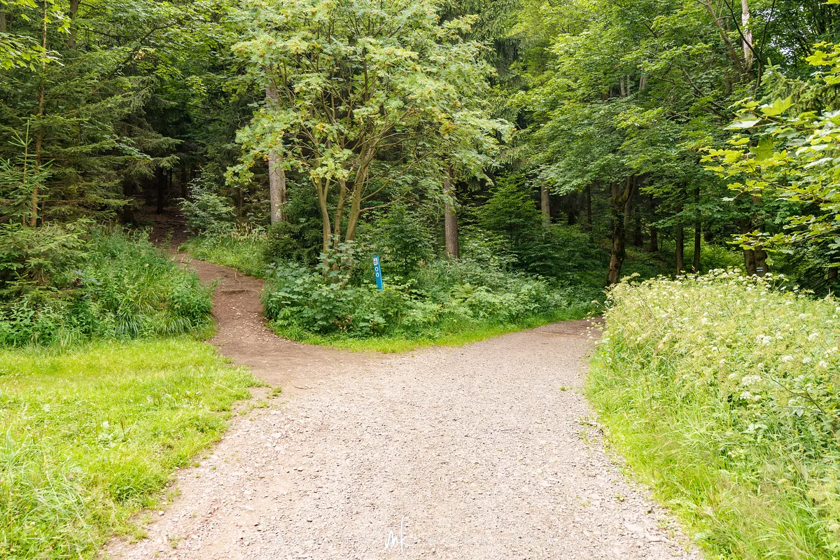 na południe, w kierunku rozdroża pod Waligórą. Docieramy tam po niecałych 30 minutach. Następnie zmieniamy szlak na niebieski
