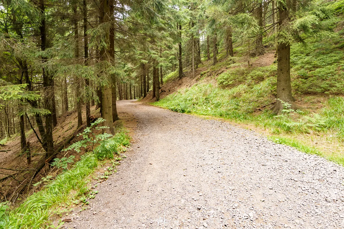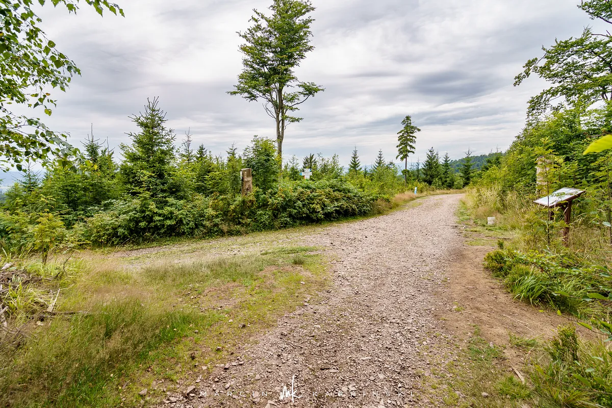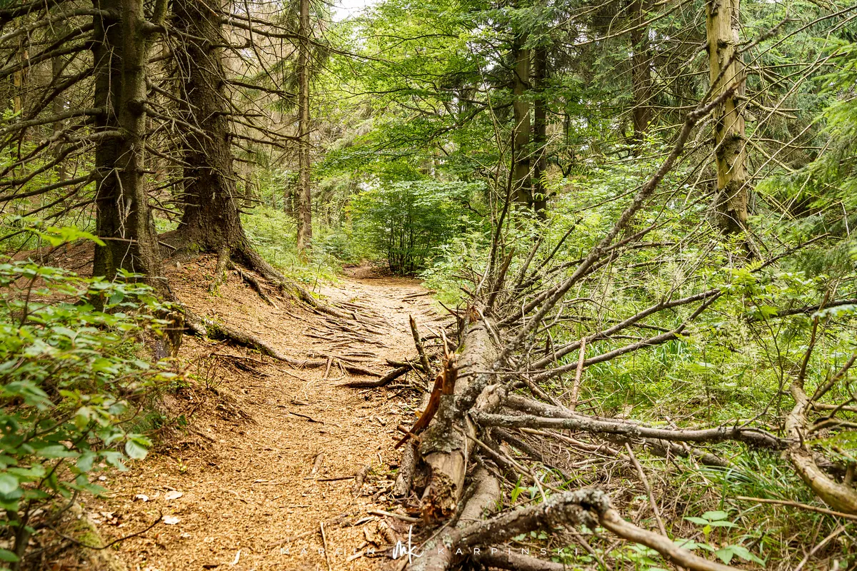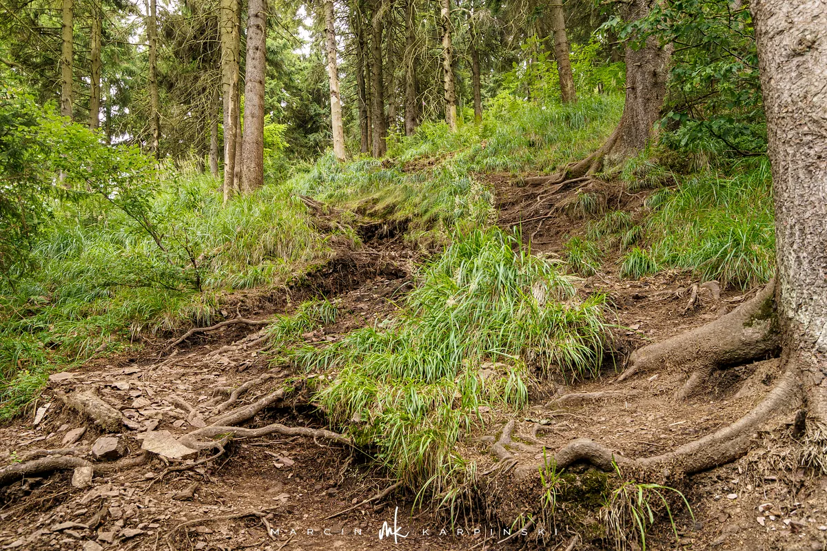szlaku pokonujemy szeroką, utwardzoną drogą. W miejscu, gdzie zakręca ona w prawo, my odbijamy w lewo, w wąską leśną ścieżkę. Stąd na szczyt pozostaje jedynie 280 metrów. Pokonanie tego odcinka zajmuje nam jednak prawie 20 minut, ze względu na niezwykle strome zbocze. Na tym krótkim dystansie musimy wspiąć się o 120 metrów w górę. Wejście ułatwiają wystające z ziemi korzenie drzew, ale trudność sprawiają liczne kamienie, szczególnie śliskie po deszczu.