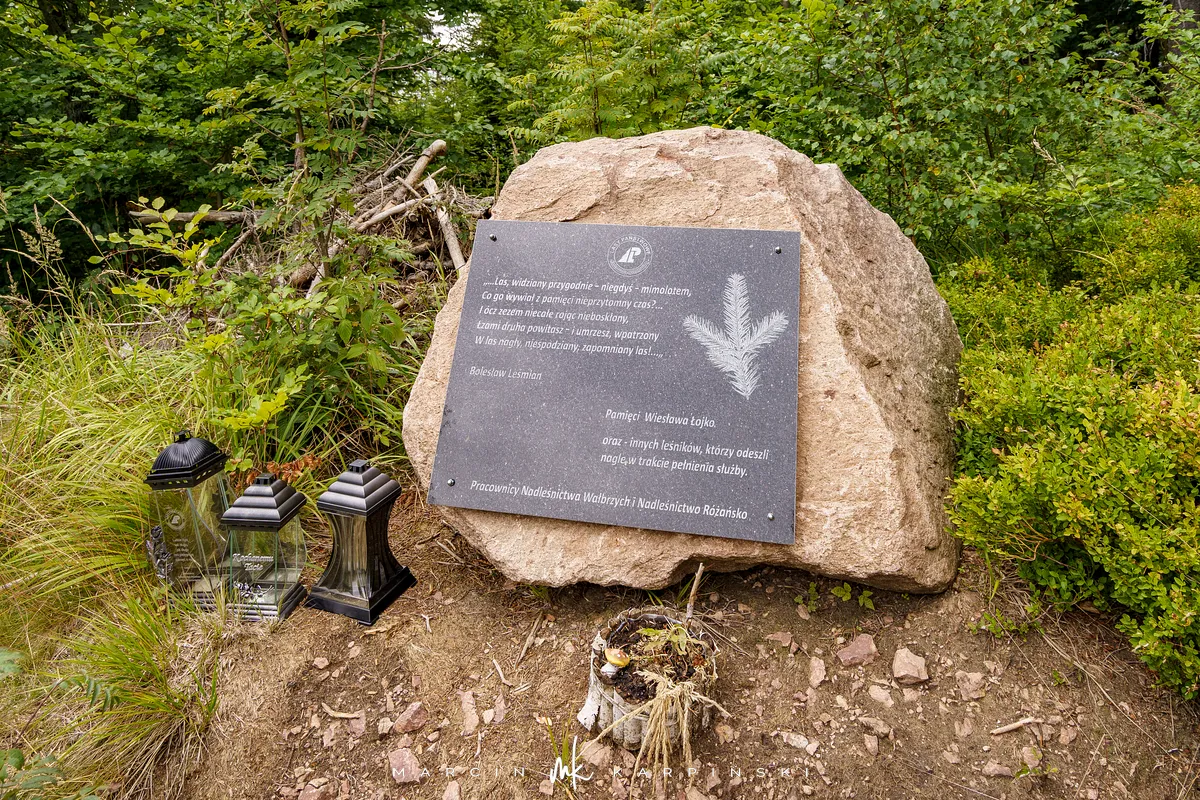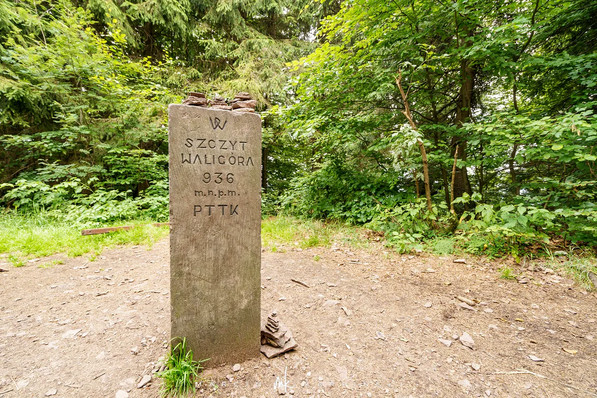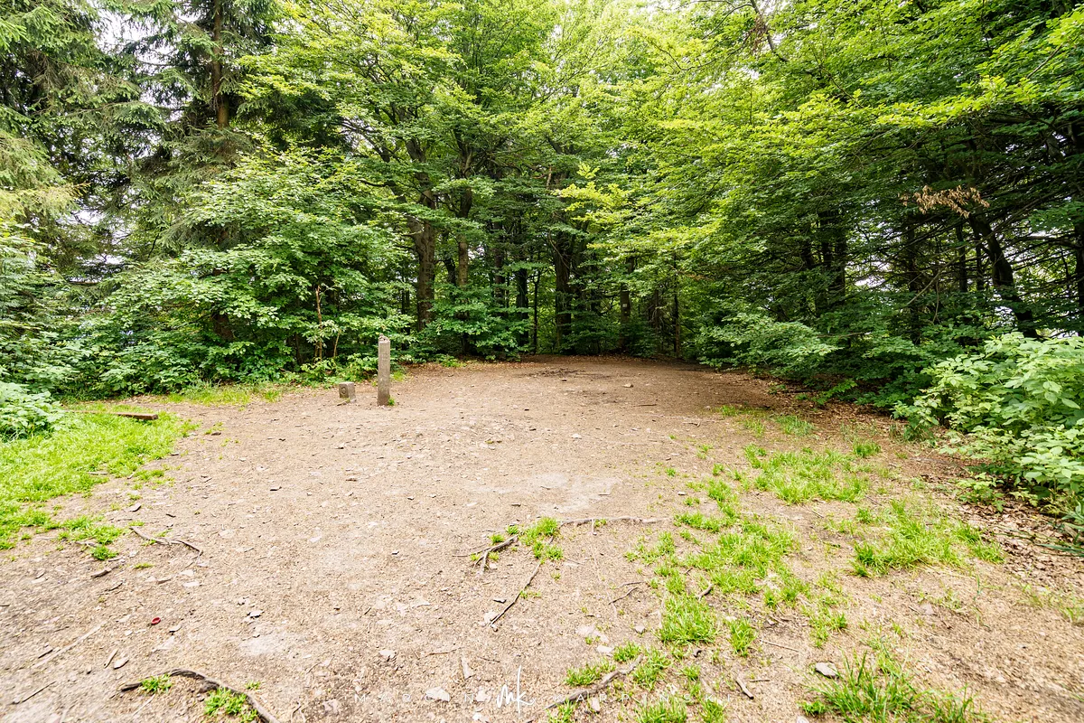 Najwyższy szczyt Gór Kamiennych jest całkowicie zalesiony. Na niewielkiej polanie znajduje się jedynie kamienny blok z nazwą szczytu i jego wysokością. Po krótkim odpoczynku kontynuujemy wędrówkę żółtym szlakiem