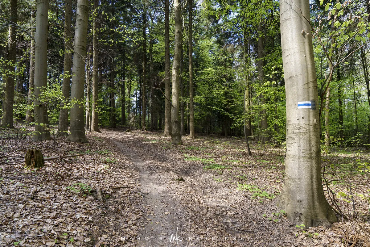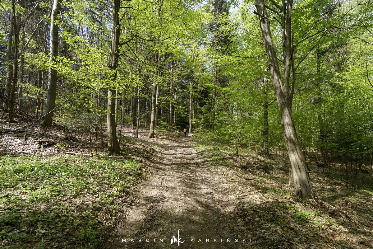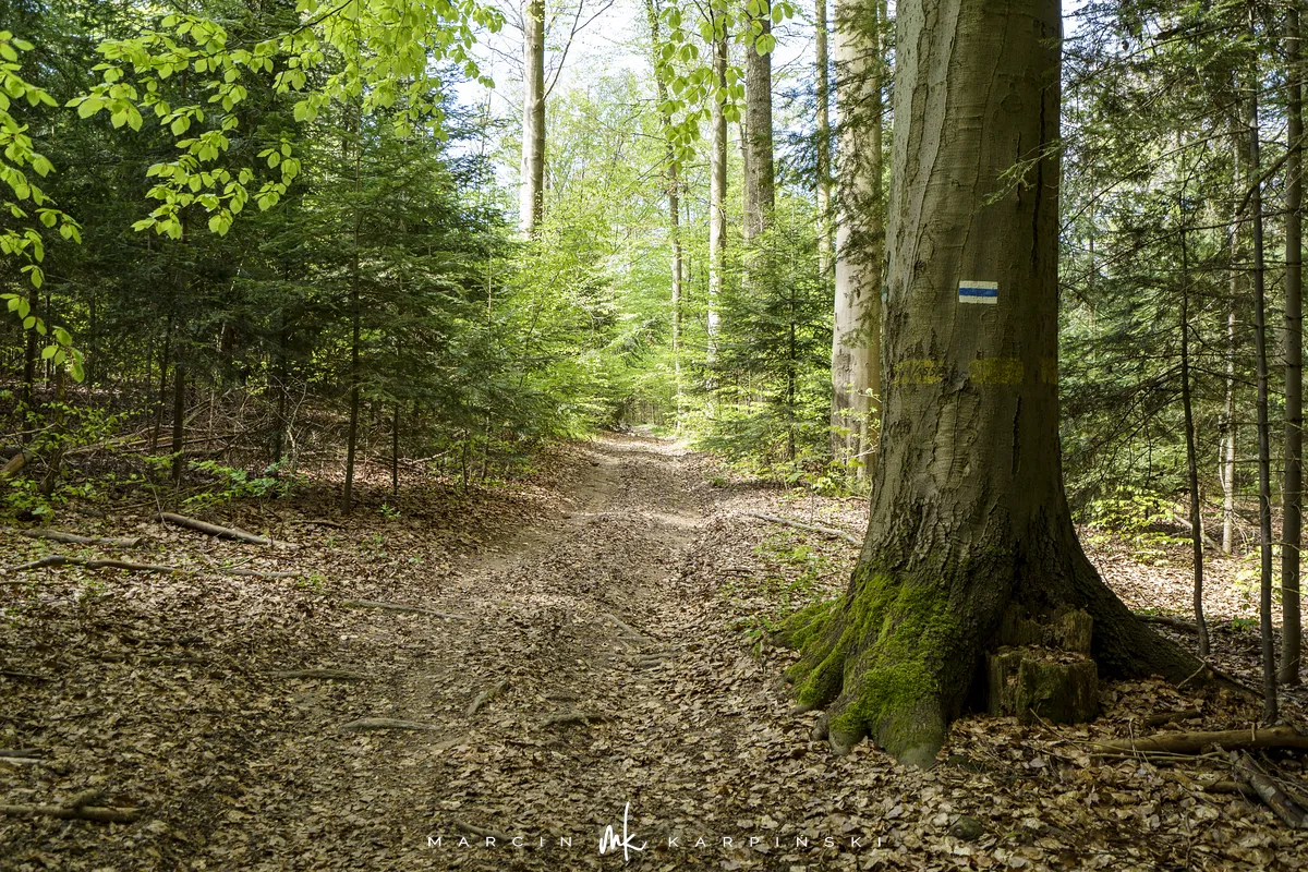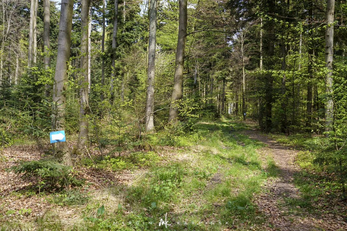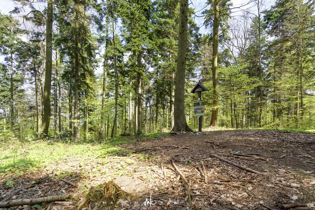 My wybraliśmy trasę z Widełek. Wyruszając z tej lokalizacji, trzeba się liczyć z tym, że nie znajdziemy tu parkingu i trzeba będzie zostawić samochód gdzieś przy drodze. Od razu wchodzimy na niebieski szlak. Przechodzimy między zabudowaniami. Polna droga wśród pól szybko pnie się do góry. To najbardziej widowiskowa część wędrówki. Po około ośmiuset metrach dochodzimy na skraj lasu. Dalszy odcinek trasy już do samego szczytu biegnie lasem. Szlak jest dobrze oznakowany. Ze względu na to, że szczyt nie znajduje się przy szlaku ważne jest, aby przy słupku oznaczonym liczbami 80/80/65/66 skręcić w prawo, w wyraźnie odznaczającą się ścieżkę. Ścieżką wędrujemy około 250 metrów i skręcamy z niej w lewą stronę w las. Pomiędzy drzewami powinniśmy zobaczyć tablicę informacyjną z nazwą szczytu. Na ostatnim odcinku wędrówki bardzo pomocna okazuje się mapa w telefonie z aktualną lokalizacją GPS. Na szczyt wchodzimy 40 minut. Droga powrotna tą samą trasą zajmuje nam 35 minut.
