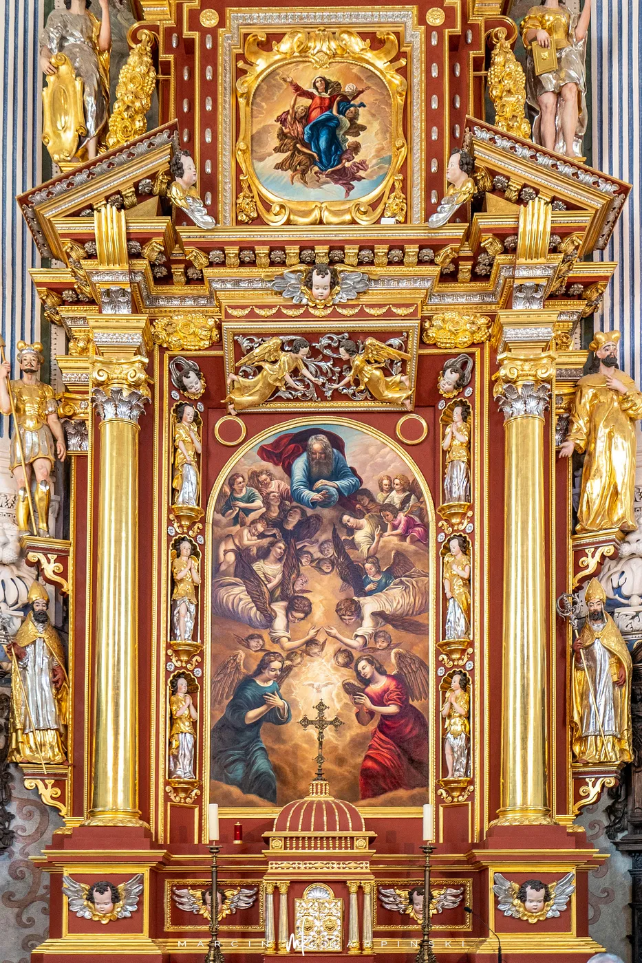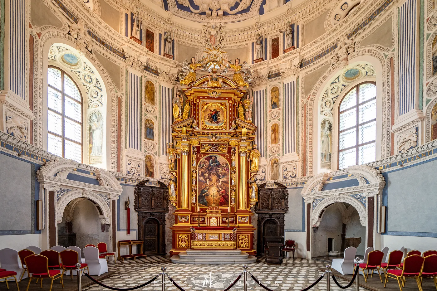 Zamek, w przeciwieństwie do wielu innych warowni, nigdy nie pełnił funkcji obronnej. Został zaprojektowany jako rezydencja, która miała imponować swoim bogactwem i stylem. Rezydencja powstała na planie czworoboku z czterema narożnymi basztami – Boską, Papieską, Królewską i Szlachecką – symbolizującymi hierarchię świata chrześcijańskiego. Charakterystycznym elementem jest piękna sgraffitowa dekoracja elewacji, jedna z największych tego typu w Europie Środkowej.