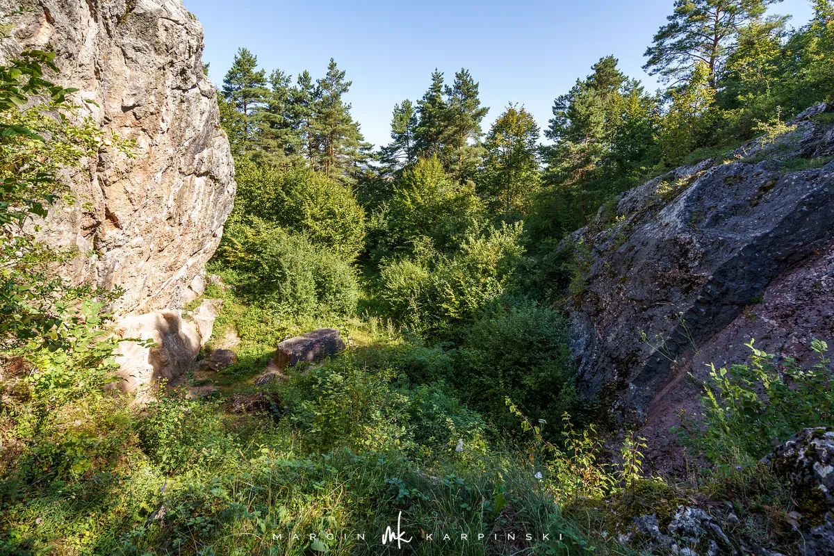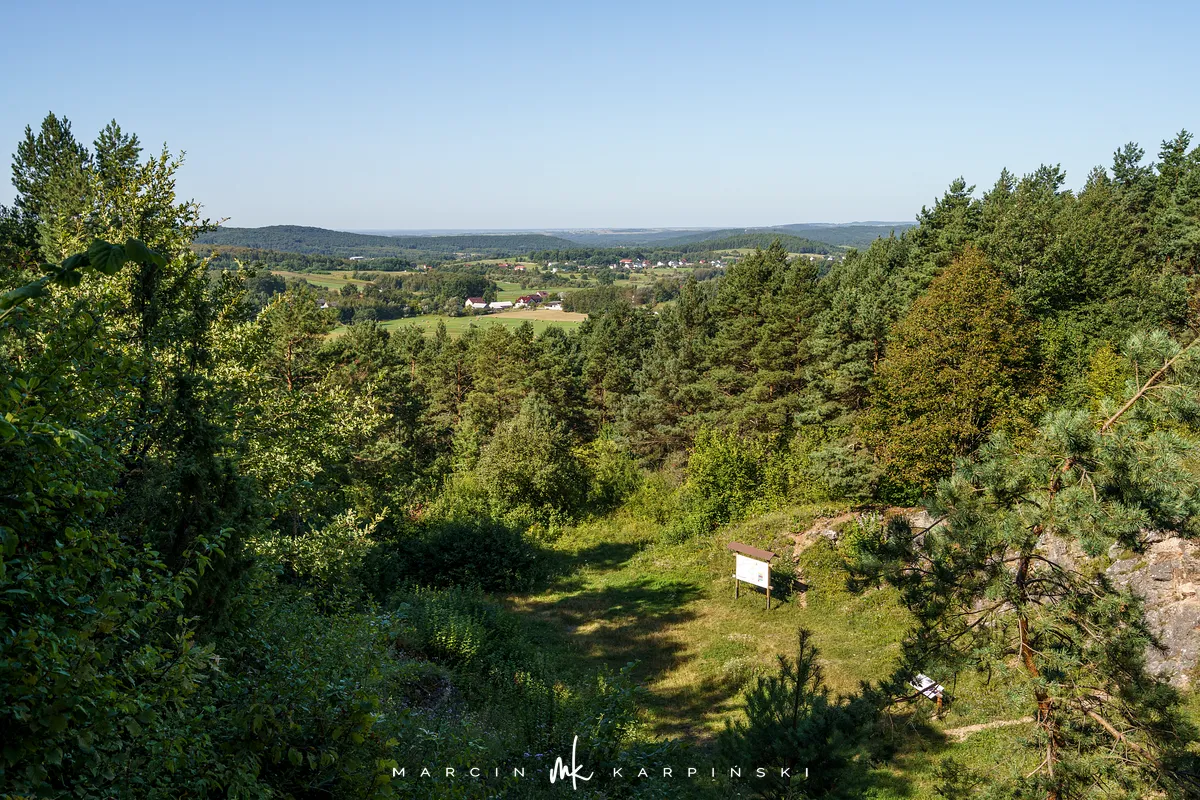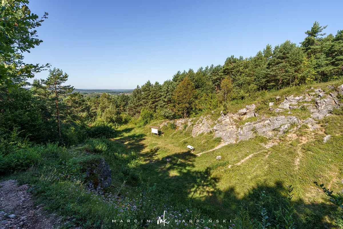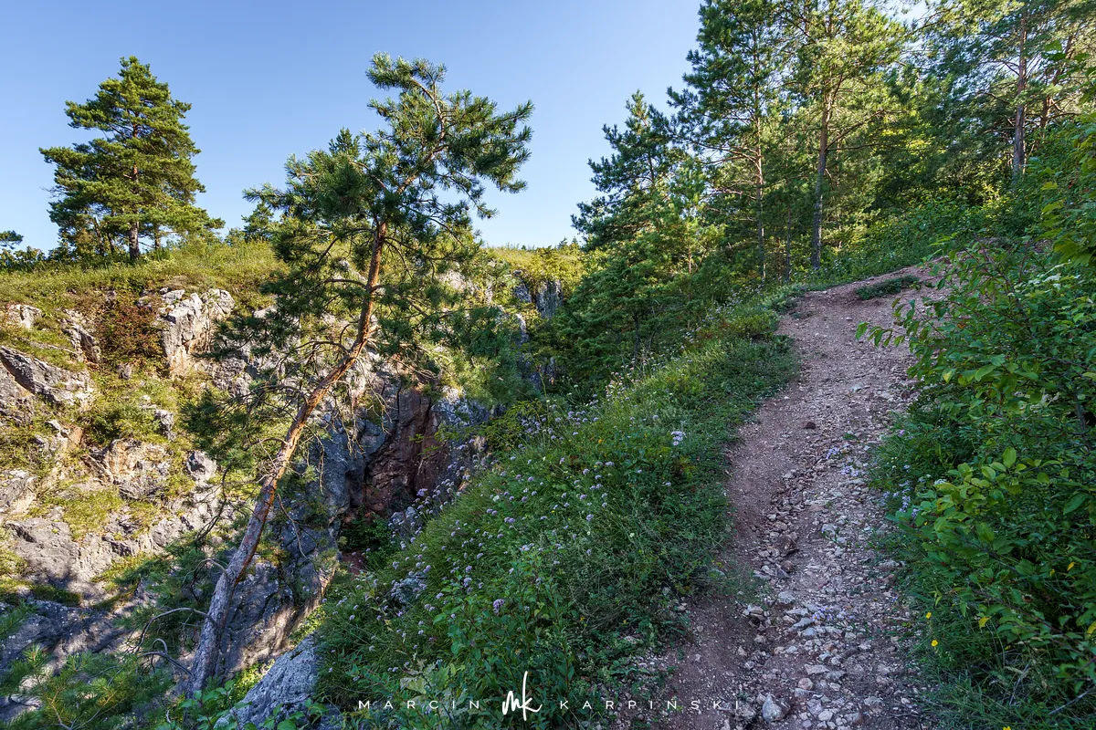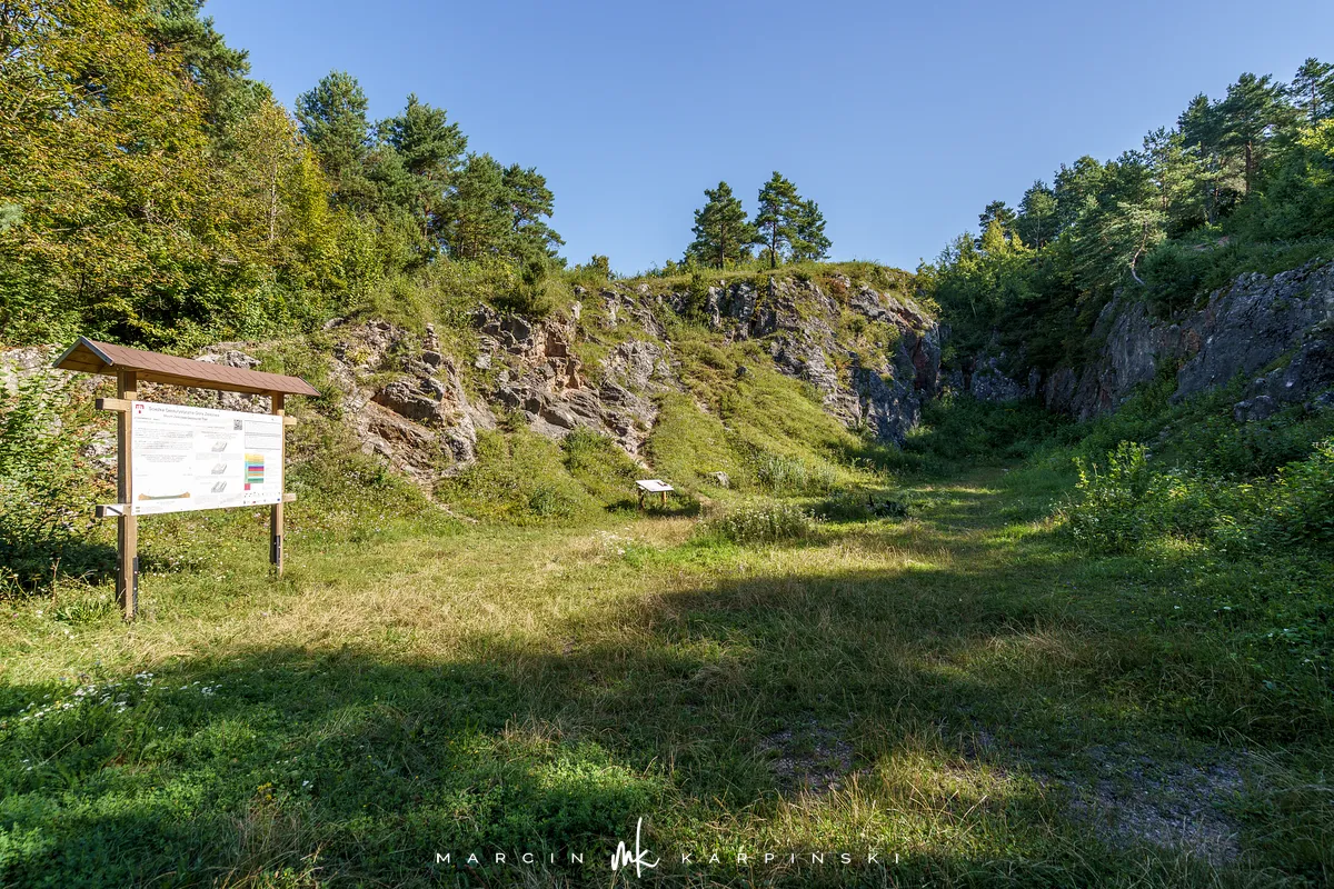 Po powrocie na szlak, dalsza droga wiedzie przez wapienną grań. Choć ten odcinek jest trudniejszy, warto go przejść, ponieważ jest to najdłuższa grań wapienna w Górach Świętokrzyskich. Po około 200 metrach docieramy do kamieniołomu Szczerba. Na ścianach kamieniołomu można zobaczyć ślady wydobycia w postaci półek skalnych i otworów wiertniczych, a na jego dnie leżą bloki marmuru. Przy kamieniołomie przebiega czerwony szlak turystyczny im. Sylwestra Kowalczewskiego, prowadzący z Kielc do Chęcin. Schodzimy nim w dół do ulicy Zamkowej, którą początkowo idziemy niebieskim szlakiem, a następnie bez oznaczeń docieramy na parking.