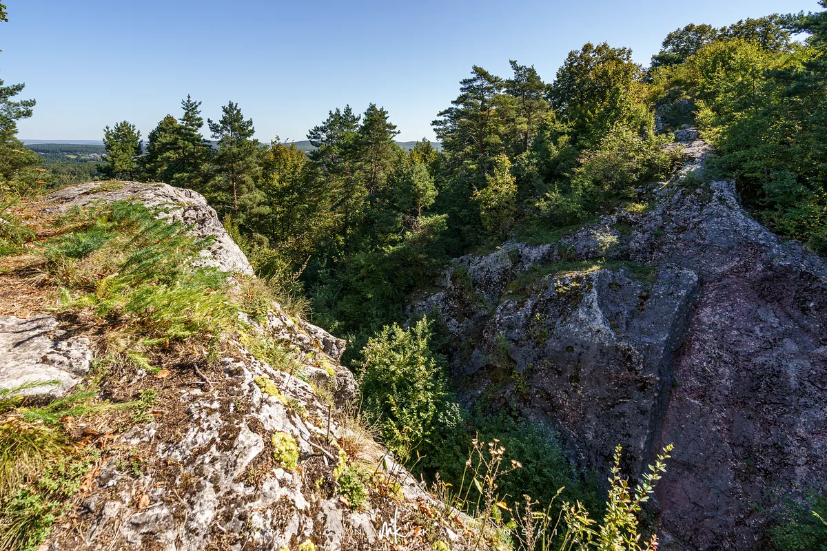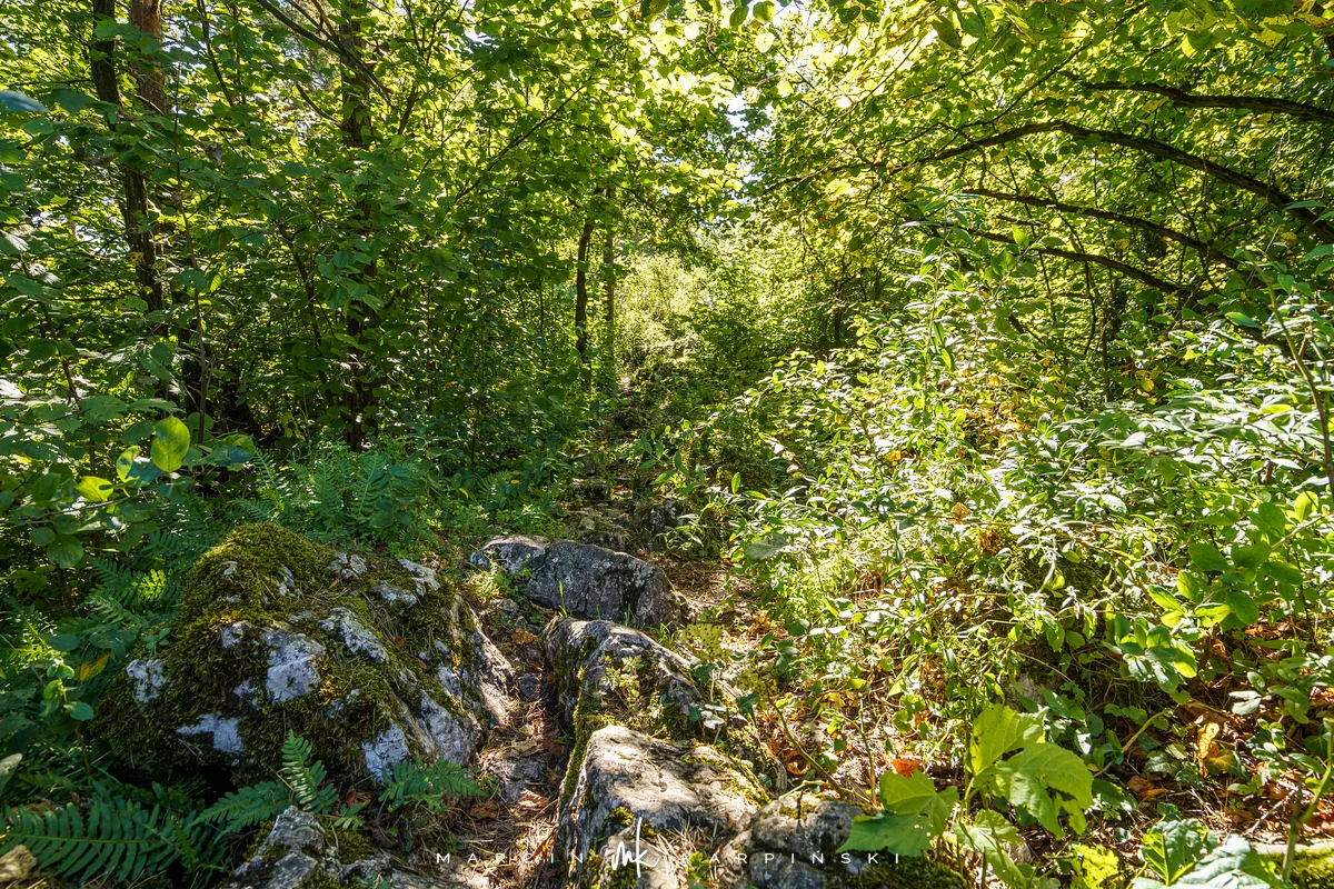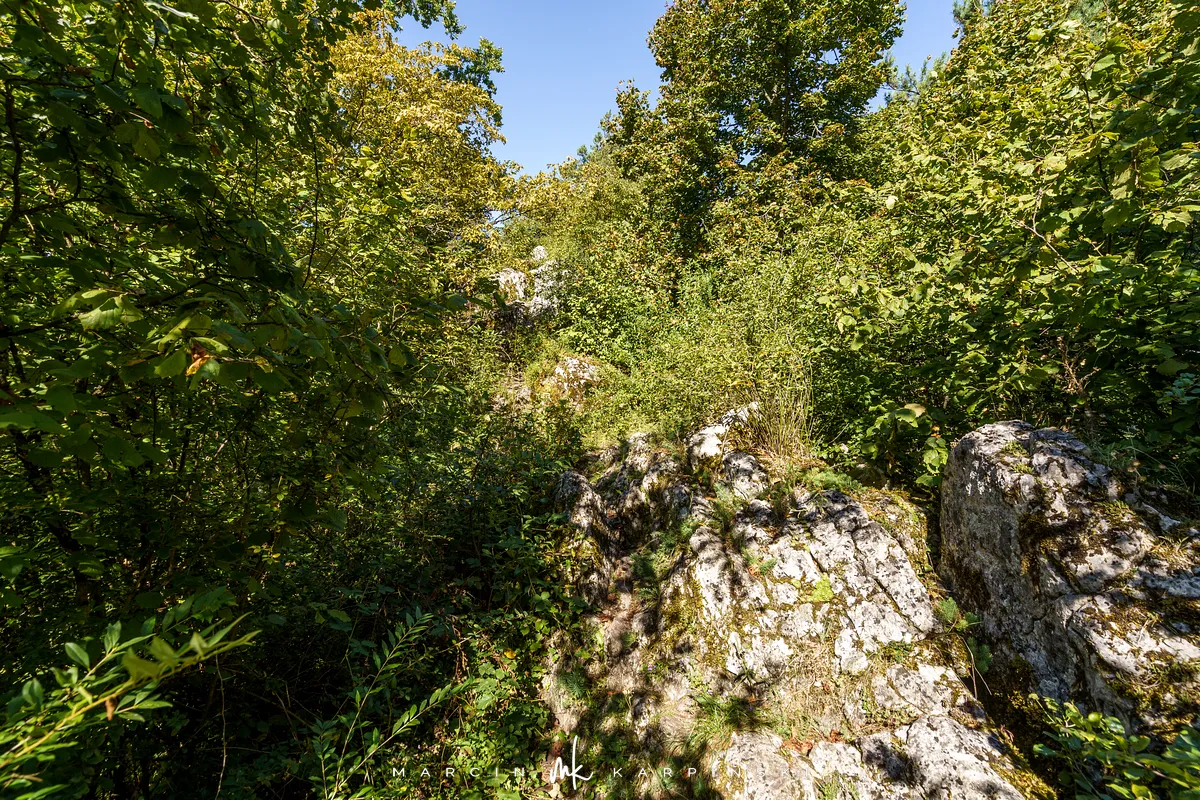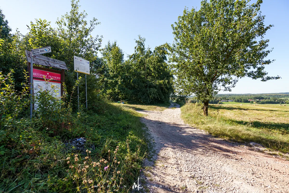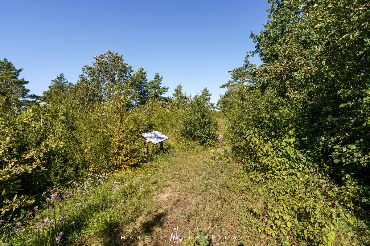 Po powrocie na szlak, dalsza droga wiedzie przez wapienną grań. Choć ten odcinek jest trudniejszy, warto go przejść, ponieważ jest to najdłuższa grań wapienna w Górach Świętokrzyskich. Po około 200 metrach docieramy do kamieniołomu Szczerba. Na ścianach kamieniołomu można zobaczyć ślady wydobycia w postaci półek skalnych i otworów wiertniczych, a na jego dnie leżą bloki marmuru. Przy kamieniołomie przebiega czerwony szlak turystyczny im. Sylwestra Kowalczewskiego, prowadzący z Kielc do Chęcin. Schodzimy nim w dół do ulicy Zamkowej, którą początkowo idziemy niebieskim szlakiem, a następnie bez oznaczeń docieramy na parking.