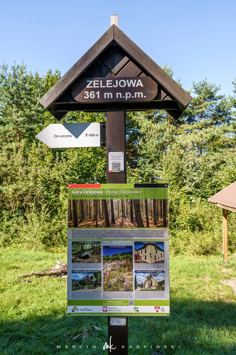 Wędrówkę na najwyższe wzniesienie Pasma Zelejowskiego rozpoczynamy z parkingu na końcu ulicy Zelejowej w Chęcinach. Idziemy w kierunku południowym ulicą Zamkową, a po kilku minutach skręcamy w lewo na niewielką polankę. Znajduje się tam początkowy punkt ścieżki geoturystycznej Góra Zelejowa oraz tablica informacyjna o szczycie Zelejowej. Odległość do szczytu z tego miejsca wynosi 400 metrów. Wędrówkę kontynuujemy ścieżką wśród drzew, aż docieramy do pierwszego kamieniołomu Zachodniego. Wspinamy się granią nad kamieniołomem. Będąc na górze skręcamy w lewo do punktu widokowego, z którego roztacza się panorama obejmująca Chęciny, Górę Zamkową, górę Rzepkę oraz Pasmo Grzyw Korzeczkowskich i Grząb Bolmińskich.